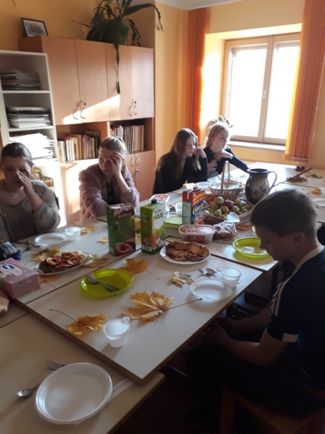 Aktivitāšu starplaikos skolēni lasīja un uzzināja intersantus faktus par āboliem. Klājot svētku galdu,tikapadomāts arī par attiecīgu noformējumu rudens noskaņās- galda kartēm izmantojot skaistas kļavu lapsa ar dalībnieku vārdiem.